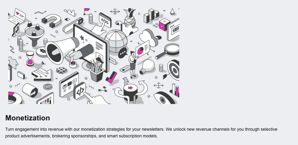 Turn engagement into revenue with our monetization strategies for your newsletters. We unlock new revenue channels for you through selective product advertisements, brokering sponsorships, and smart subscription models.